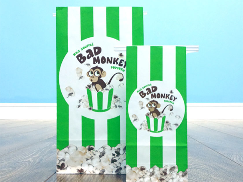 Création de l’image de marque de Bad Monkey Popcorn, d'emballage et produits promotionnels.