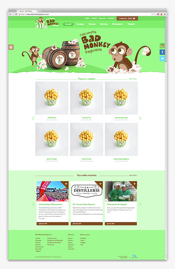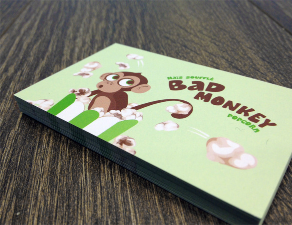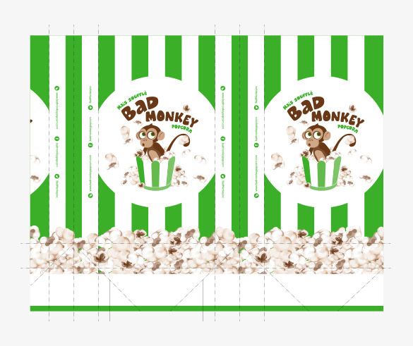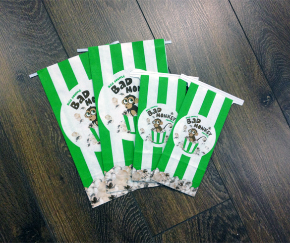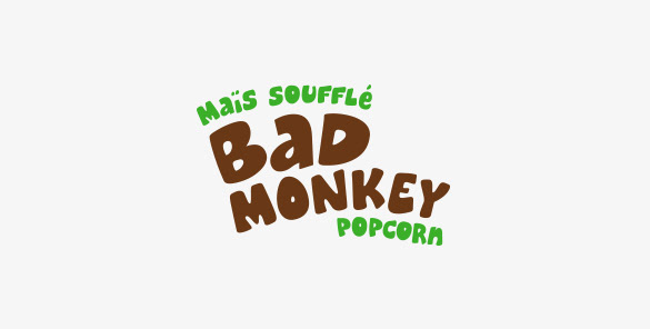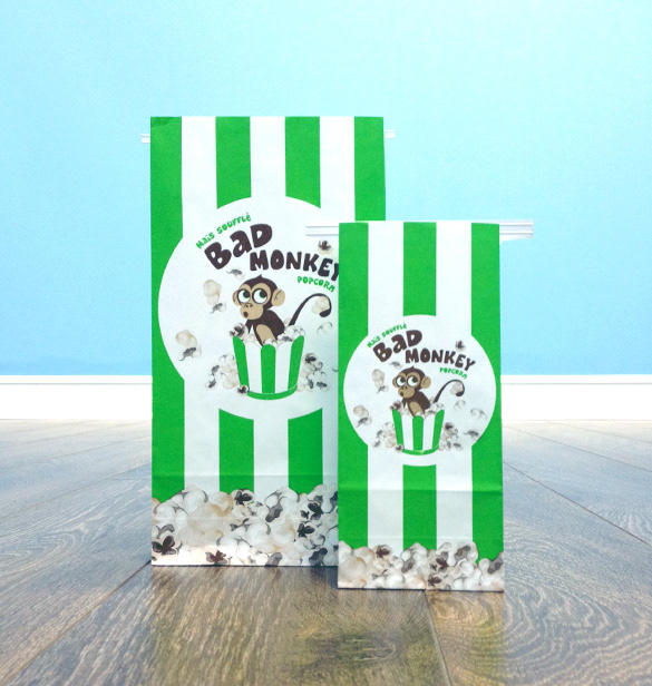 Création de l’image de marque de Bad Monkey Popcorn, d'emballage et produits promotionnels.