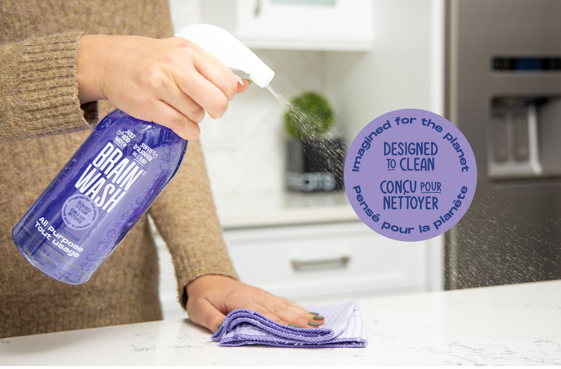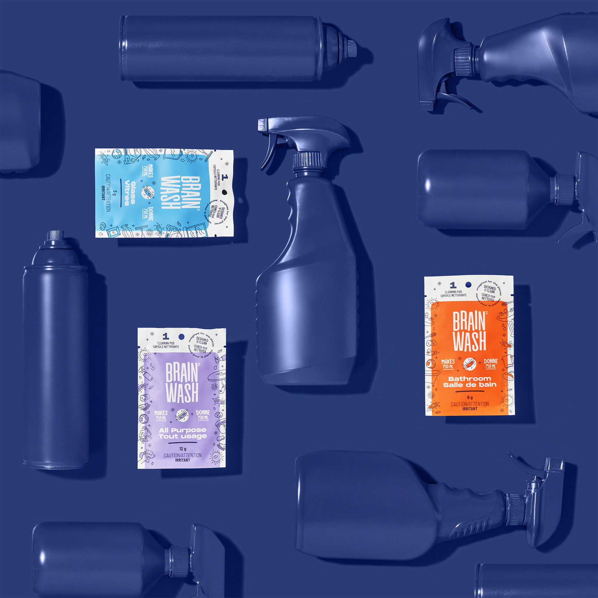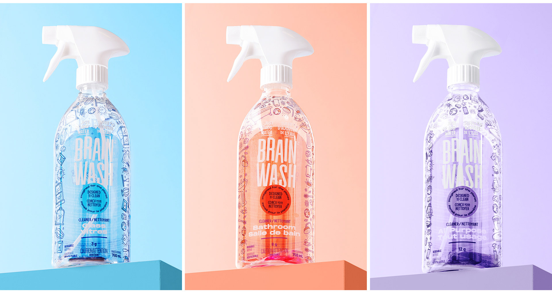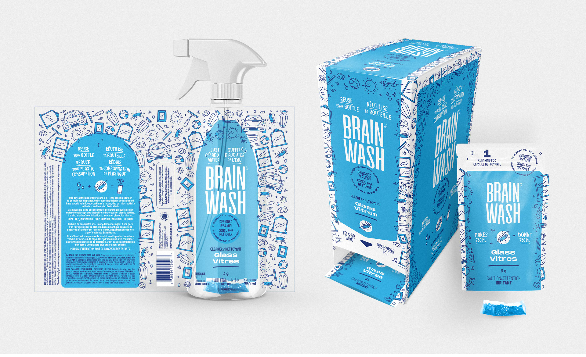 La marque et ses messages sont directement inspirés de l’approche visionnaire de Brain Wash et de son fondateur. Tel qu’identifié lors de la stratégie, près de 95% du contenu d’une bouteille de nettoyant est uniquement de l’eau. La marque Brain Wash permet de repenser sa façon de nettoyer tout en consommant moins de plastique. L’entreprise se soucie d’offrir une alternative plus responsable dans le rayon des nettoyants et s’attaque aux enjeux environnementaux, comme la réduction de l’utilisation des emballages à usage unique. La signature de marque choisie pour Brain Wash représente bien cette position: Conçu pour nettoyer. Pensé pour la planète.