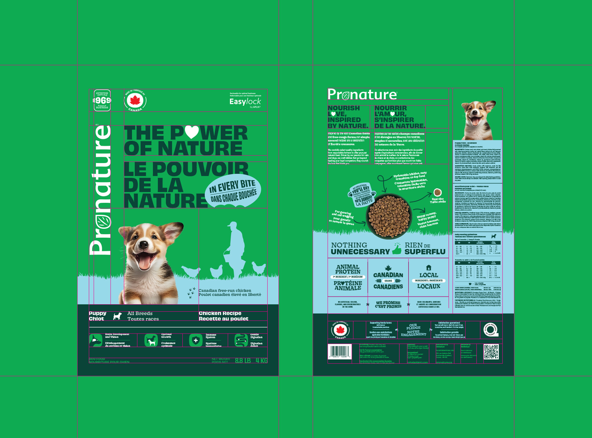 Pronature, marque emblématique de nourriture pour animaux de PLB International, faisait face à des défis croissants: hausse des coûts et baisse de la rentabilité. Avec une présence significative au Canada et une forte reconnaissance internationale, la mission était de revitaliser l’emballage pour rester compétitif tout en maintenant le prix économique. Gaspard Agence a été chargé de repenser entièrement les emballages afin d’en faire un outil de communication efficace qui reflète la qualité et le positionnement naturel de la marque. En complément de la refonte visuelle, nous avons soutenu le lancement avec la création d'outils de vente adaptés, des messages percutants et une activation MLV, afin de maximiser l'impact en magasin et auprès des partenaires.