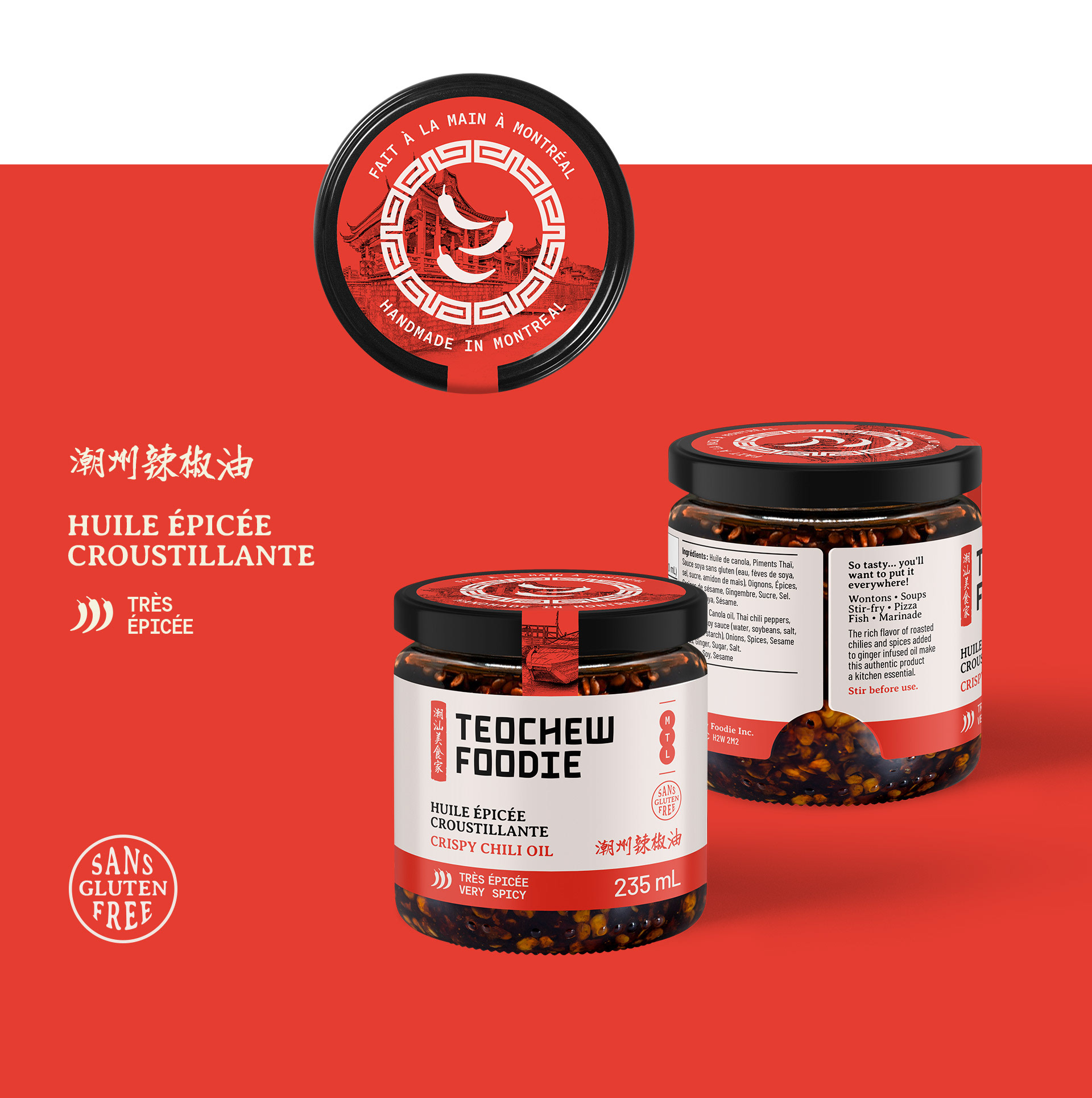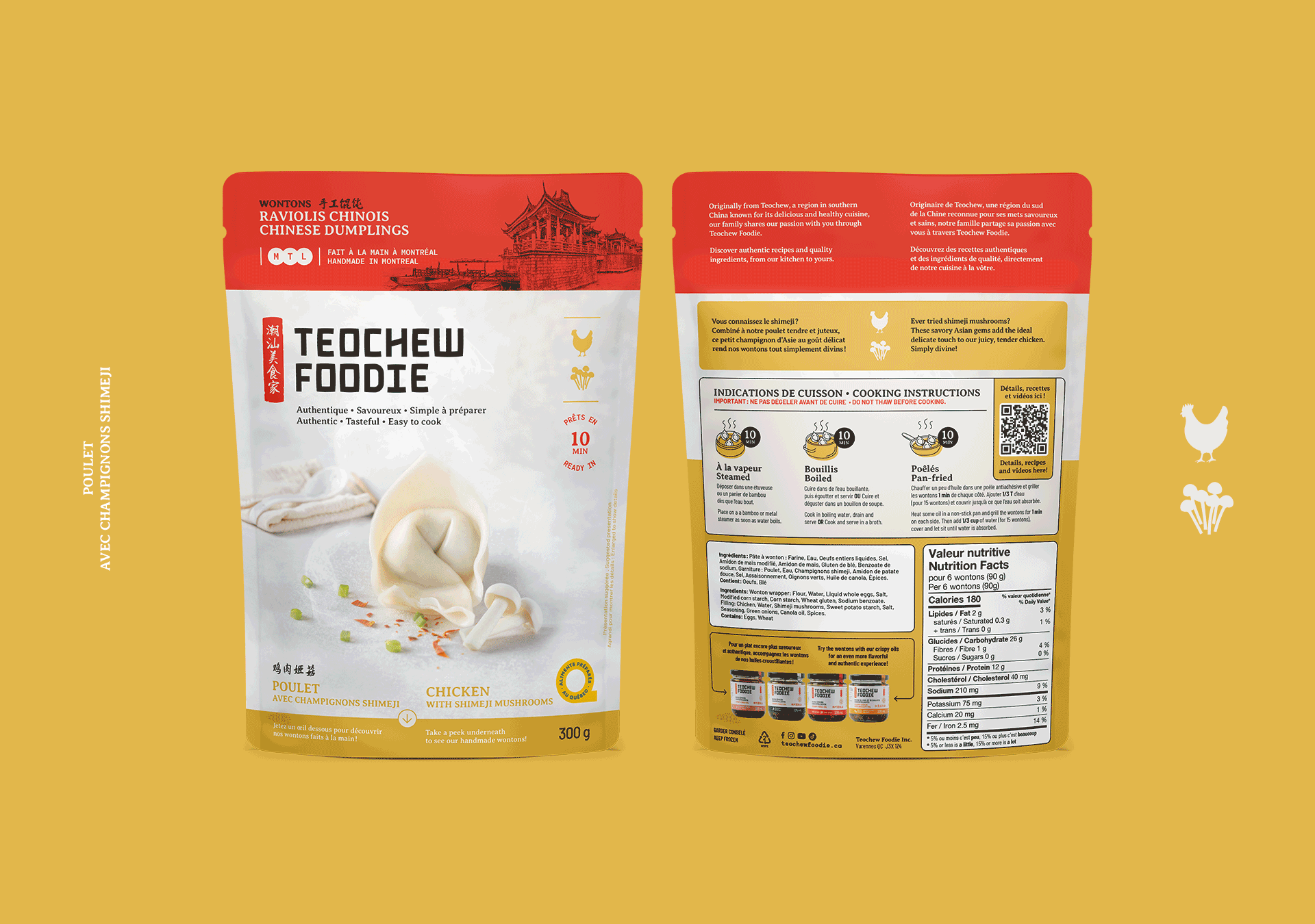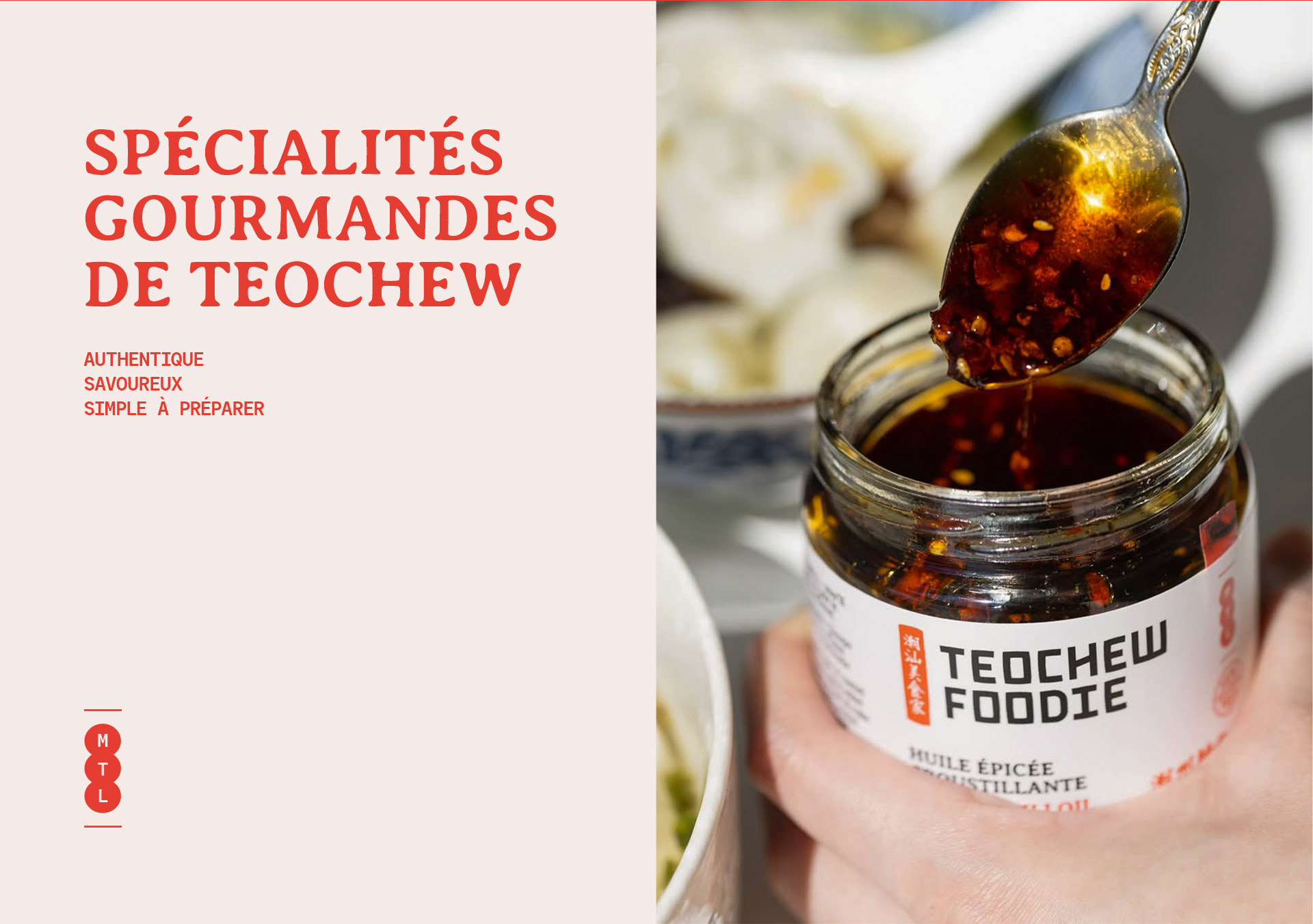 Les emballages prolongent cette vision, combinant tradition et innovation. Une charte couleur spécifique identifie chaque saveur, complétée par des icônes distinctives, des photos des ingrédients, et une iconographie intuitive pour guider les consommateurs. Cette approche visuelle et fonctionnelle traduit une stratégie audacieuse qui communique avec force l’authenticité, l’unicité et la qualité, des valeurs au cœur de la vision de Teochew Foodie.